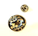 青の背景に クローバーのゴールドのデザインのチェコガラスボタンで ピンブローチを作りました。