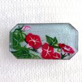 「赤い朝顔」は大きめの帯留め金具を使用しているため、レジンとアクリル絵の具をそれぞれ10回描いたり、硬化させたりしています。表面張力を利用しているので、八角形の帯留めは10回が限界だと今回思いました。。。