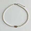 こちらはガラス素材の原玉に、オリジナルパール塗料にて何層にも渡り重ね塗りを施した日本製ガラスパールネックレスになります。パールカラーは、きめ細かい質感と優しい艶感が特徴のホワイトクリーム色。ホワイトベースにほのかに色づいた色合いです。パール間には銀メッキのグラスビーズを、またネックレス中央付近にはシェル素材でマーブル模様の茶色いスクエアパーツをアクセントに加えました。パールサイズは直径約6mm玉とやや小振りで、長さは標準的なプリンセスサイズの全長約40cm。テールエンドにアジャスターを付けていますので、約5cm程の延長も可能です。