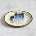 赤土に白化粧泥を刷毛で手塗りし、その上から藍色の呉須を使い、筆の線の動きで表現した絵皿になります。