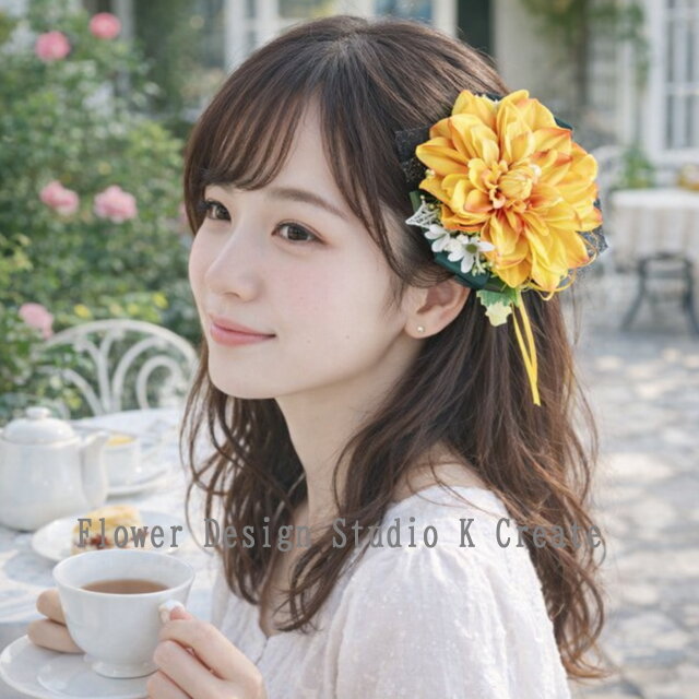 イエローのダリアとグリンリボンのヘアクリップ ダンス 成人式 袴 入学式 卒業式 オレンジ イエロー フラメンコ 髪飾り