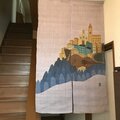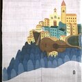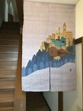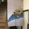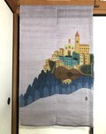麻100%のれんに、ロウケツ染の技法を使って、イタリアの街に楽器が溶け込んでいる風景を染めました。
