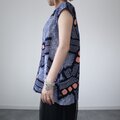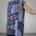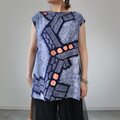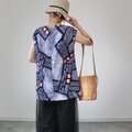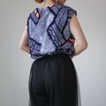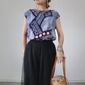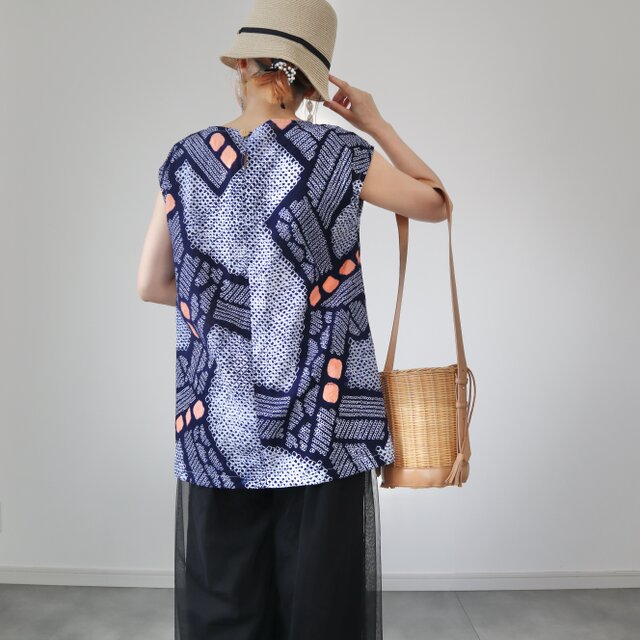 古い浴衣から作ったフレンチ袖のAラインブラウスです。藍色×白ベースの薄手で柔らかい絞り染め。長め丈で裏地はありません。