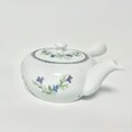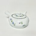 白磁の急須に、スミレの花を散らして描いて、プラチナで装飾しました。