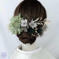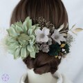 やさしいくすみグリーンのダリアに、透明感あふれる小花と深みのあるモスグリーンラメのお花を添えた、静かに輝く髪飾り。
