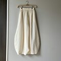 ウエストからヒップラインのほどよいゆったり感。腰から裾にかけてのゆるやかなボリューム感。すっとしぼられた裾部分の形。