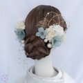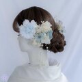 氷のように澄んだアイスブルーと優しく輝くペールブルーの花々が、清楚で上品な美しさを演出する髪飾りセットです。