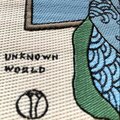 幾何学模様や反復的なパターンに留まらず、具象的な図像を織りで再現している点において、織柄表現の領域は大きく拡張されており、織物の魅力をさらに広げます。原画と比較すると、色糸の選び方や重ね方によって自然な濃淡が生まれ、まるで木版画のような趣さえ感じさせます。