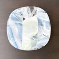 半透明の白と透明な青と黄緑色が重なり合う模様の皿です。