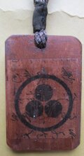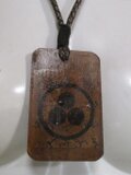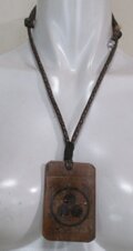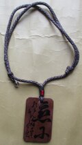 泥大島紬の着物で作ったループを付け、ループの先に赤の山サンゴ、木札を付け、首の所の端に、水晶を付けています。
