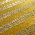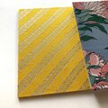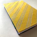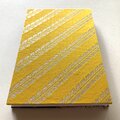 裏面には、伝統的な植物文様を銀糸で織り出した布地を使用。レモンのように明るく、エネルギーに満ちた黄色を基調に、斜めに流れるような文様が上品なリズムと洗練を感じさせます。この柄は「繁栄」「豊穣」「実り」を象徴する吉祥文とされ、未来への希望や成長を祈る御朱印帳に、そっと優しく寄り添う模様です。銀糸の光沢は光の角度によって陰影を変え、織物ならではの奥行きと気品を添えます。織りの精緻さと手に取ったときのやわらかな質感は、視覚と触覚の両面から高い完成度を体感させてくれるでしょう。
