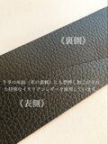 使用した革はイタリアPoletto社の黒いダブルフェイスのシュリンクレザー。牛革の表裏両面にシュリンク型押しの特殊加工がされているので、裏地は不要で裏面の毛羽立ちが一切無く、両面共に美しいイタリアンレザーです。手触りはしっとりなめらかで吸いつくような感覚の柔らかいレザーです。シュリンクレザーは爪などの傷が目立ちにくく、またシミにもなりにくいので多少の雨に濡れてもすぐに拭き取れば大丈夫です。天気を選ばず普段使いで気楽に使用できるのが良いところです。
