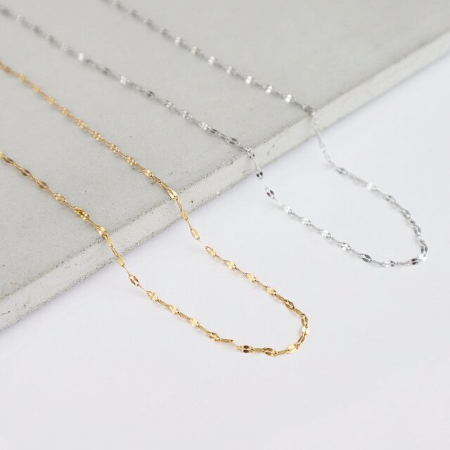 角度が変わるたびにキラキラと上品にきらめくペタルチェーンを使用したネックレス。