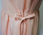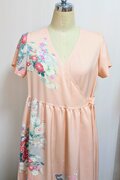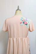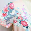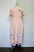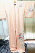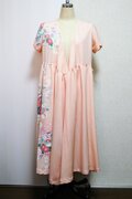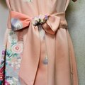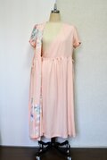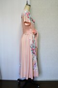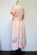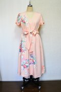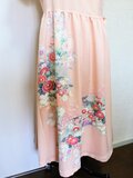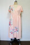 淡いサーモンピンクに花柄の吉兆柄文様の着物をリメイクしてカシュクールワンピースを作りました。