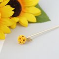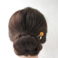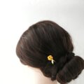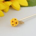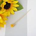 色紙とレジンで作った紙花を球体に仕上げ、金色の葉っぱを添えた 向日葵の玉かんざし です。