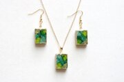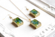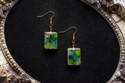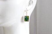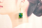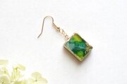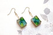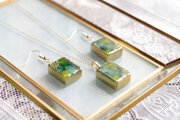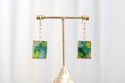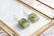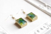 数種類のグリーンが滲みあうレジンを金色で縁取り、青海波模様を描いた、小さな玉手箱のようなピアス。