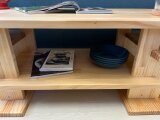 早速据えてみました。 木目が透けて見えるグレイの色も落ち着いた印象で良い感じです。 脚を木製のネジ込み式にしていただけたおかげで、脱着可能な上、足などぶつけてもあまり痛い思いをせずに済みそうで、これもまた良かったです。 ご対応も速く感謝申し上げます。 大事に使わせていただきますので、どうもありがとうございました。