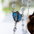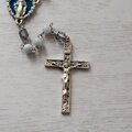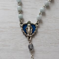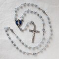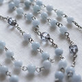 マリアの祈りの珠にはアクアマリン、主の祈りの珠にチェコビーズを使ったロザリオです。
