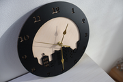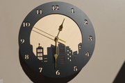 夜の都市をイメージしたデザインが特徴の木製時計。ビル群の影が浮き出たようなデザインで、背景の木の色とのコントラストが特徴的です。。インテリアにアクセントを加えるデザイン性を持ち、ナチュラルインテリアにぴったり。都会の雰囲気を感じさせる一品となっております。