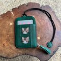 グリーンの牛革に茶トラ猫の刺繡を施し、パッチワークをして仕立て上げました。
