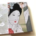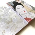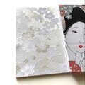 裏表紙には、白地にやわらかな金糸や白糸で桜が織り出された金襴生地を使用しています。満開の桜の下に立つ女性の姿と重ね合わせながらも、彼女の心の中に咲くのはまだ『白いまま』の、誰にも知られぬ恋。華やかさではなく、純粋さ。成就ではなく、想いの静けさ。その対比を、表と裏の布地で繊細に表現しました。両面を合わせた絵を、『一篇の詩のように静かに心を揺らす』を目指しました。