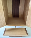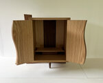 そこで紹介するのが、これまでに考えてきた一つの基本デザインのお仏壇・L字脚・タモです。シンプルな四角形のシャープな構造に、L字型の板脚と前後の細いピン形の脚、合計4点で支える特徴的なデザインです。特徴的な脚は、一般的なお仏壇のどっしりとした感じとは異なるものです。私のイメージとして、お仏壇は天国へ召された故人の場所ということから、本体を少し浮かせた印象にしています。