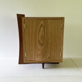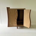 左右非対称な観音開きの扉は、合わせ目を逆S字状にカット。扉の表面は中央下へ向かうほど隆起していて、その下端もしくは左右の合わせ目のスキマに指を掛けて開けます。扉はマグネットで固定されるので、扉を閉めると、最後の方でぱたんと閉まる感じの力加減です。