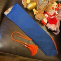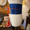 【名古屋帯 リメイク サッシュベルト 飾り帯 和洋折衷 ハンドメイド レトロ 古着 L〜LL対応 藍が灯し、朱が舞う。 ROB-115】
