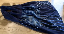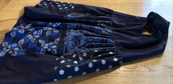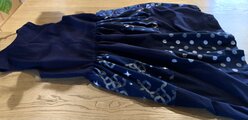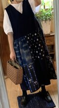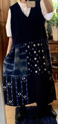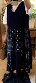 家紋古布のワンピース家紋がメインの スッキリしたデザインが とっても 素敵! 太い刺し子の糸が 家紋を 引き立てて 個性的な ワンピースの 仕上がりに。