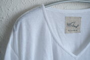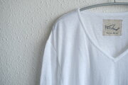 リネンの通気性の良さや柔らかさとコットンの強さを兼ね備えていて、蒸れずに、心地よい肌触りでさらっと着られます。首回りはVネックで広く取ってあり、インナーとしてとても使いやすい形です。