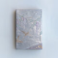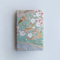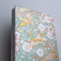 心安らぐエメラルドグリーンの生地に新春を感じる梅の花と大きく翼を広げ、優美に羽ばたく鶴。