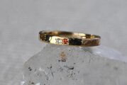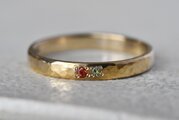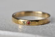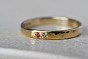 シンプルな平打ちの槌目リングに美しいオレンジサファイアとペリドットを留めて制作を行いました。さらりと身に着けやすくも他にはない特別感を感じられる作品に仕上げることができました。