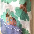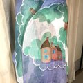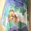 麻100%ストールに、フランスの田舎町の家をデザインして、ロウケツ染の技法を使って、染めました。