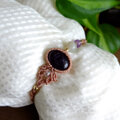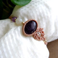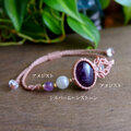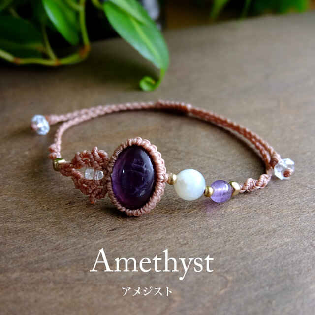 しっかりと濃いパープルカラーが気品を感じられるブラジル産アメジストをメインに、サイドに月の光のようにしっとりと煌めくシルバームーンストーン丸玉を組み合わせた1点ものアシンメトリマクラメ編みブレスレットです。