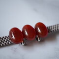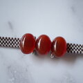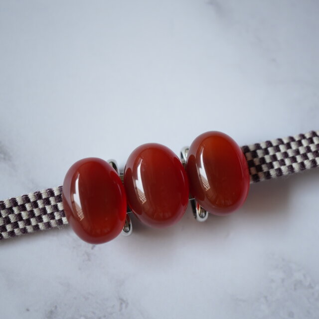深みのある赤が印象的な天然石・赤瑪瑙(カーネリアン)を、シンプルに三連で仕立てた帯留めです。