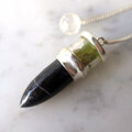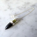 トップ部分を外してチェーンをつければペンダントトップとしても活用できる、ブラックトルマリンとペリドットを用いた、デザイン性の高い天然石ペンデュラムです。