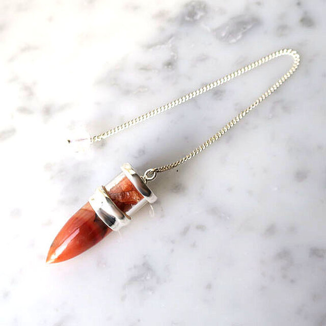 トップ部分を外してチェーンをつければペンダントトップとしても活用できる、カーネリアン(瑪瑙)とサンストーンを用いた、デザイン性の高いパワーストーンペンデュラムです。