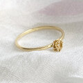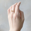 細い甲丸リングにプチっと咲いた小花が指先を明るく彩ります。リアルな花弁の重なりがシックな印象でかわいくなりすぎずオフィススタイルにもマッチします。カラーストーンリングとの重ね着けもブーケのように華やかになりおすすめです。