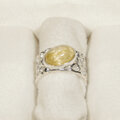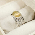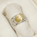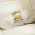 透明感が高く、明るい金色の針がたくさん綺麗に見えるルチルクォーツの指輪です。たくさん並んだ金の針の上をキャッツアイの様に光の線が映り行きます。