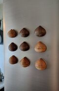 その芯材と辺材の色の違いを利用し、栗の形を彫り込んでマグネットにしました。