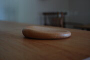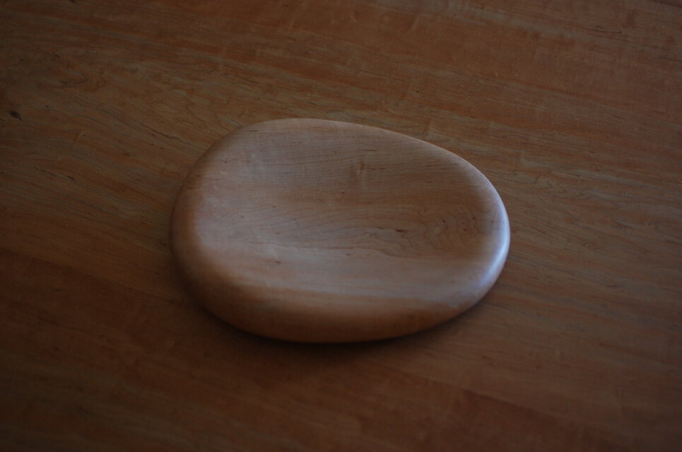 小石のような皿です。カエデ材をツルツルに磨いてオイル塗装してます。長辺が25センチ短辺が20センチ。高さは片方が高く5センチ低い方が3センチ。