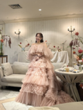 実例写真!カラードレス 薄桃色 オフショルダー 柔らかく重ねたチュールスカート ロングトレーン 前撮り