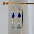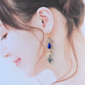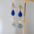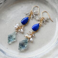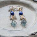 アフガニスタン産のラピスラズリとフローライトに原石ダイヤのフリンジを組み合わせたブルーが印象的なピアスです。