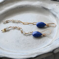 アフガニスタン産のラピスラズリに14kgfオーバルチェーンとムーンストーンのチェーンが揺れるロングタイプピアスです。