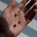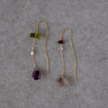 マスカットグリーンのペリドットに、ワインレッドのガーネット、小粒ながら存在感のある淡水パールや、透明感が際立つダブルポイントクリスタルを、ランダムに配したスレッダーピアス。複数のチェーンを組み合わせることで、洗練された中にニュアンスのある輝きをまとわせました。左右で異なる色合いを見せる氷菓子のようなフローライトが、涼やかで愛らしい横顔をつくります。