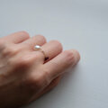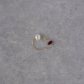柔らかな曲線フォルムの淡水パールに、エッジが効いたマーキス型のガーネットを掛け合わせ、ほんのりモードな雰囲気が漂うリングに仕立てました。対照的なふたつの素材をつなぐのは、フラットなひし形のチェーンと、シンプルな細身のチェーン。甘さと辛さをミックスしたほどよい存在感で、手元にさり気なく華を添えながら、繊細な指先を際立たせてくれます。