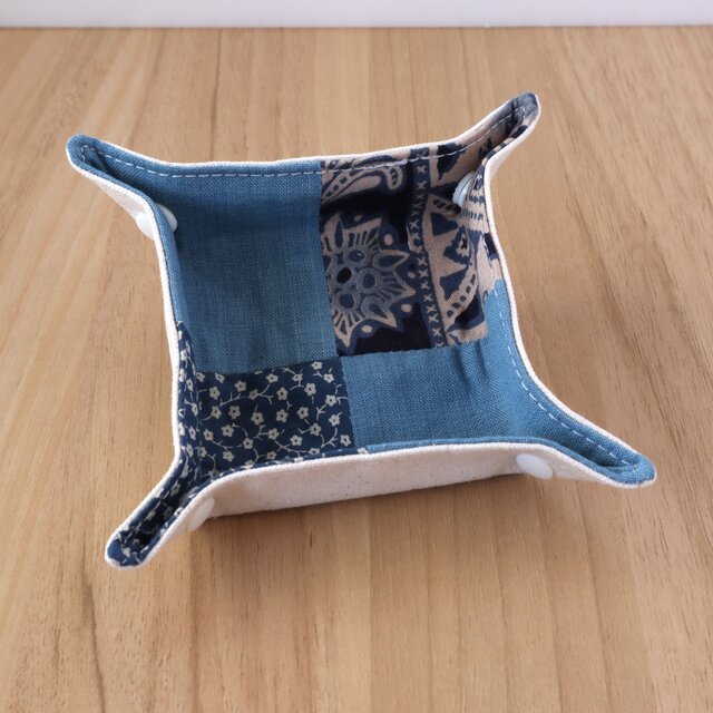 帆布とパッチワークを組み合わせた、ファブリックトレイです。
