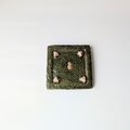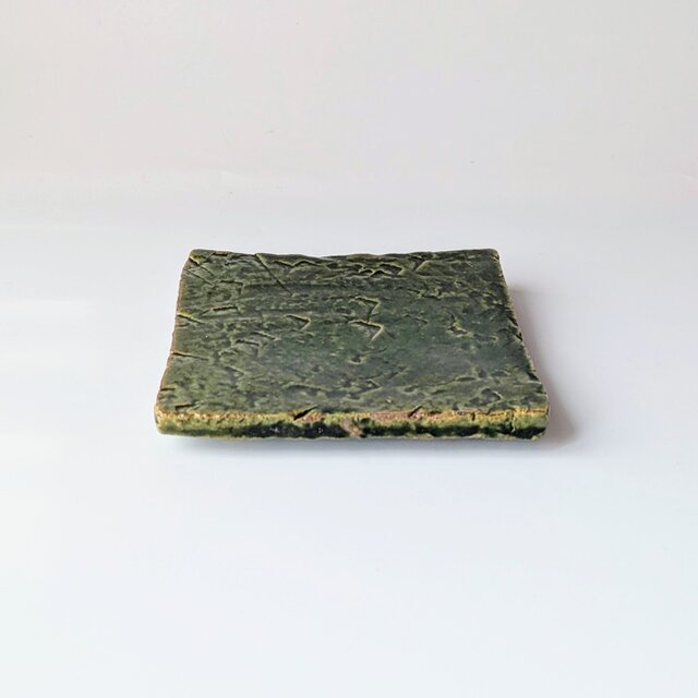 釉薬は、織部釉で、模様の凹凸に釉薬が入り込み、濃淡ができ、大変美しい表情ができました。荒々しい中にも釉薬の美しさも相まって気品ある仕上がりになりました。