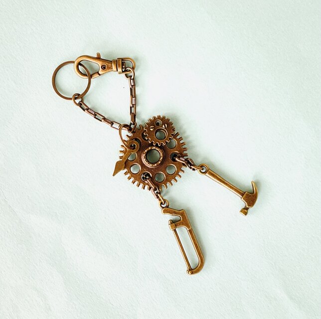 チェーンで提げた、金古美のミニチュアなトンカチ・のこぎりもアンティークな雰囲気を醸し出しています。