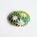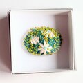 サーモンピンクの地に黒い花の刺繍、ありそうでなかったこの色のとりあわせ、すてきなブローチでした。